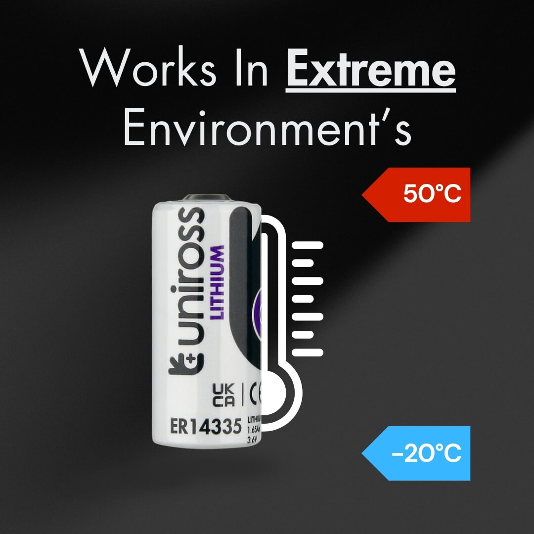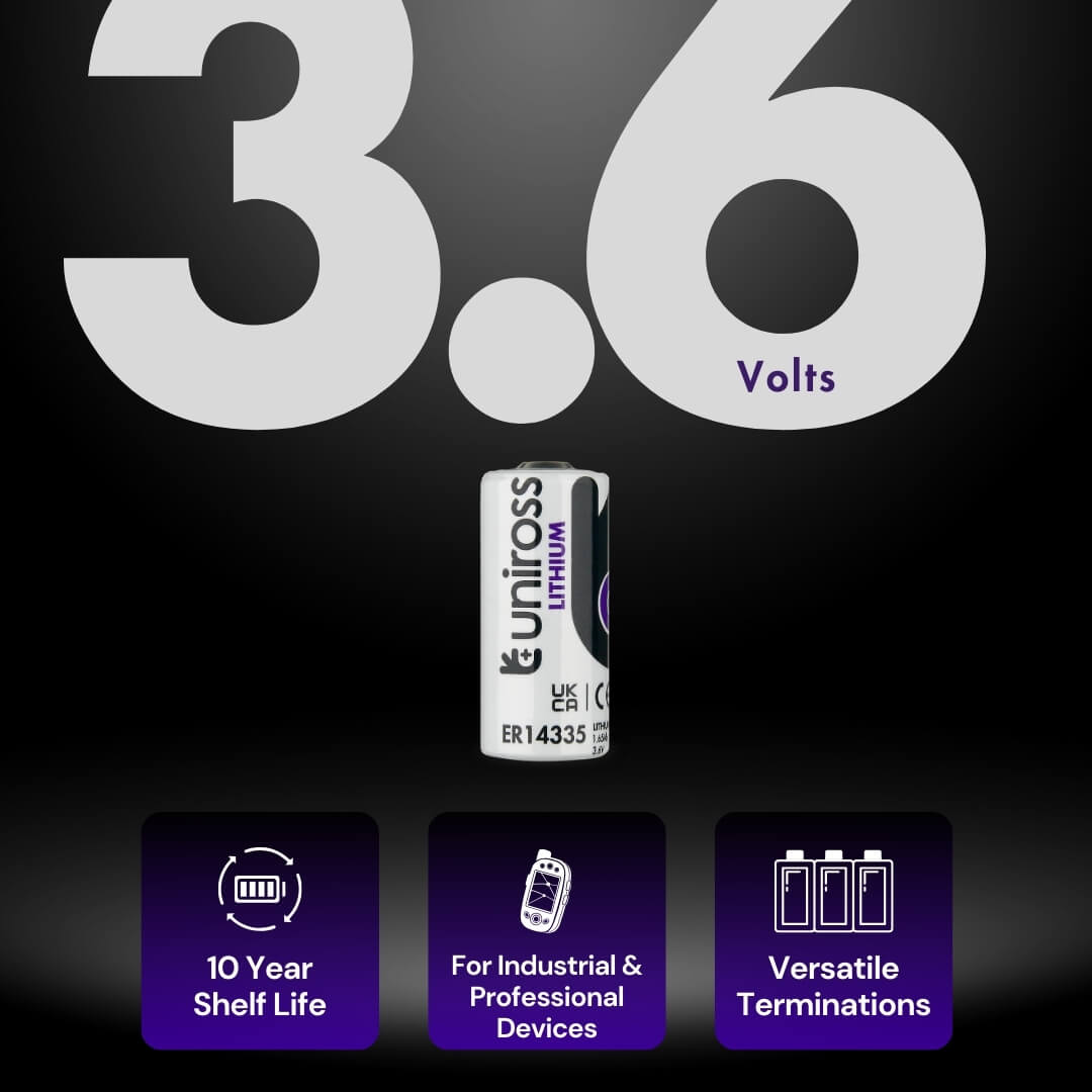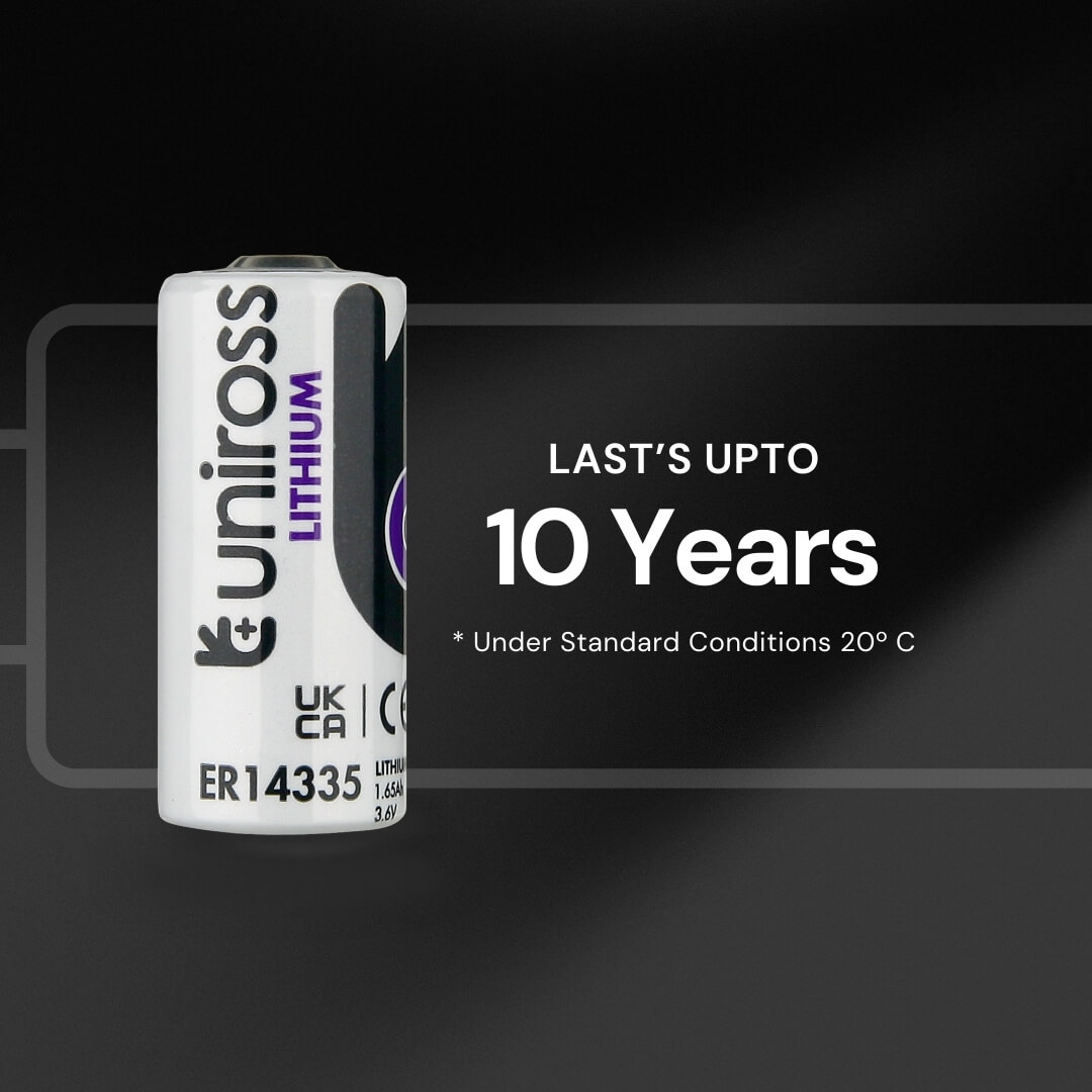 Engineered for maximum endurance in critical industrial deployments. The Uniross UER14335 (2/3AA) is a high-performance Lithium Thionyl Chloride (Li-SOCl2) battery designed for B2B applications that demand extended operational life and reliability in extreme conditions. Featuring a superior energy density of over $620~Wh/kg$, this battery provides a robust power solution for professional equipment where maintenance access is limited.
